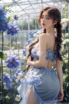 1girl,masterpiece,A beautiful and delicate girl,grace,Glass house,Brilliant flowers,Luxuriant plants,Blue flowers,Rembrandt light,Glass flower room,Blue skirt,Beautiful and delicate eyes,(braid:1.3),Tender,(grace:1.2),(fine gauze:1.2),Perfect breasts.,Plump buttocks,UHD ,<lora:Glass flower room_20231028153630-000006:0.7>,cinematic lighting,textured skin,8k,