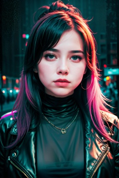 city street, neon, fog, volumetric, closeup portrait photo of young woman in dark clothes,