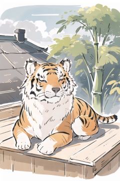 , lovely,1 Tiger,(((solo))),bamboo,rooftop,anime,old street, sleeping, squinting,qiuyinong, dahuangdongjing, corgi style by snatti, cozy animation scenes