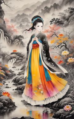 traditional chinese ink painting,black and white ink painting,<lora:GuFengXLLora:0.5>,Women, flower skirts, colorful, beautiful, fall, fallen leaves, Vegeta's background, Flower Armor, autumn theme, battlefield smoke, exposure mix, medium shots, Bokeh, (HDR: 1.4) , high contrast, (film, warm yellow and orange: 0.85) , (soft colors, dark colors, soothing tones: 1.3) , low saturation, (xxmix women) , Rainbow Girl, bhikkhu, oil painting, candy-coated