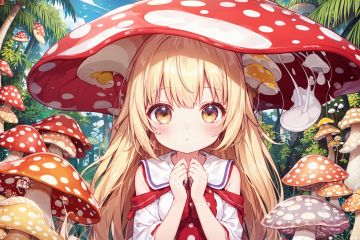 Forest after rain, Amazon rainforest, lots of tropical trees, palm trees, lots of giant mushrooms, lots of poison mushrooms, red and white spotted mushrooms, purple mushrooms, yellow mushrooms, white mushrooms, explosion mushrooms, charm mushrooms, fluorescent mushrooms(monsterification:1.3), (1 giant mushroom_girl, wearing Spotted dress, spotted mushroom hair), (spotted mushroom hat:1.2), (upper body), (cute face), beautiful eyes(detailed light), (extremely delicate and beautiful), volume light, best shadow, flash, Depth of field<lora:aki-000008:0.8>