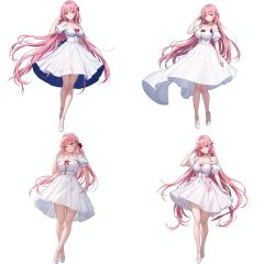Realistic style, cinematic work, 8K wallpaper, masterpiece, very realistic quality, best quality, masterpiece, high-level, high-resolution,,,blfengge, 1girl, solo, long hair, pink hair, full body, breasts, white background, blue footwear, simple background, very long hair, looking at viewer, smile, bangs, dress, standing, short sleeves, bare shoulders, cleavage, skirt, bare legs, collarbone, hair ornament, hand up, bow, closed mouth, puffy sleeves, white shirt, shirt, hand in own hair, medium breasts, shoes, off-shoulder shirt, large breasts, blush, short dress, red bow, blue skirt, off shoulder, puffy short sleeves, thighs, choker, pink eyes, white dress, high heels, high-waist skirt