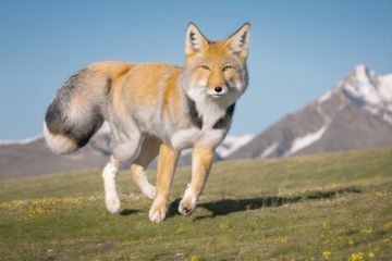 highres,sky,rock,dof,mountain,tibetan,fox,tibetanfox,high detail fur,looking at viewer, Fechin,calm,small eyes,jumping