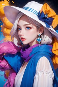 1girl, white colored hair,Colorful hat,colorful earrings, blue scarf, blue eyes,Earrings, gemstones,Starry sky, colorful splashes,