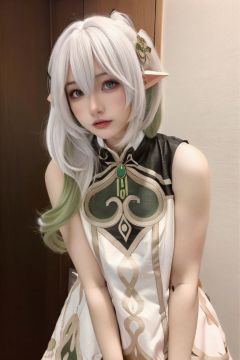 nahida \(genshin impact\), 1girl, solo, looking at viewer, pointy ears, white hair, multicolored hair, side ponytail, hair ornament, dress, long hair, white dress, bangs, green hair, hair between eyes, lips, gradient hair, realistic, cross-shaped pupils, sleeveless dress, bare shoulders, green eyes, sleeveless, closed mouth, symbol-shaped pupils, leaning forward