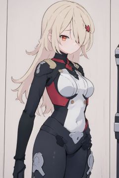 1girl, solo, long hair, hair over one eye, blonde hair, bodysuit, hair ornament, breasts, red eyes, closed mouth, looking at viewer, covered navel,  bangs, medium breasts, hairclip, orange eyes,naimeixisiXF,