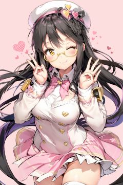 1girl, solo, one eye closed, black hair, long hair, thighhighs, yellow eyes, glasses, smile, heart hands, heart, white thighhighs, skirt, looking at viewer, hat, blush, yellow-framed eyewear