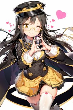 1girl, solo, one eye closed, black hair, long hair, thighhighs, yellow eyes, glasses, smile, heart hands, heart, white thighhighs, skirt, looking at viewer, hat, blush, yellow-framed eyewear