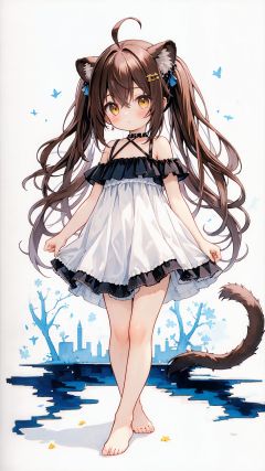 1girl, lion ears, lion tail, virtual youtuber, tail, dress, animal ears, solo, long hair, lion girl, white dress, ahoge, full body, yellow eyes, looking at viewer, barefoot, sleeveless dress, brown hair, standing, sundress, sleeveless, white background, bangs, bare legs, bare shoulders, hair between eyes, simple background, frilled dress, bare arms, closed mouth, collarbone, blush,(cute loli),cityscape,street