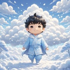 masterpiece,MiRU,chibi,1 boy,Black hair,solo,full body,Spirit,Smile,Outdoor,Light blue sky,Clouds,magic,A fantastic scene,It snows,cold,textured skin,super detail,best quality,,
