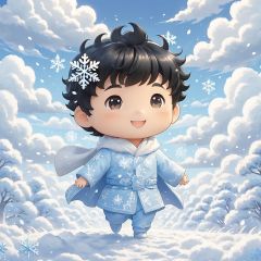 masterpiece,MiRU,chibi,1 boy,Black hair,solo,full body,Spirit,Smile,Outdoor,Light blue sky,Clouds,magic,A fantastic scene,It snows,cold,Snowflake,textured skin,super detail,best quality,,