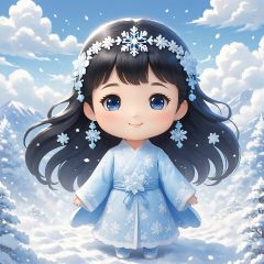 masterpiece,MiRU,chibi,1girl,Black hair,solo,full body,Spirit,Smile,Outdoor,Light blue sky,Clouds,magic,A fantastic scene,It snows,cold,Snowflake,textured skin,super detail,best quality,,