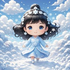 masterpiece,MiRU,chibi,1girl,Black hair,solo,full body,Spirit,Smile,Outdoor,Light blue sky,Clouds,magic,A fantastic scene,It snows,cold,Snowflake,textured skin,super detail,best quality,,