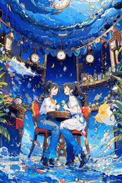 (masterpiece:1.2), best quality,PIXIV, fairy tale style, multiple girls, 2girls, clock, short sleeves, black hair, sitting, closed eyes, chair, long hair, plant, cup, shoes, table, dress, shirt, open mouth, black footwear, water, fish, signature, bubble, pants, wide shot, leaf, white shirt, smile, ponytail, blush, holding, black dress, medium hair, book, waves <lora:fairy tale style-000016:0.8>