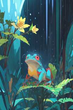 -style by snatti, no humans, frog, rain, pokemon \(creature\), glowing, solo, lily pad, red eyes<lora:style by snatti-000018:0.9>