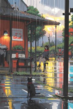 (masterpiece:1.2), best quality,PIXIV, style by snatti, 1girl, rain, solo, sitting, cat, scenery, black hair, outdoors, black cat, skirt, plant, bench, long sleeves<lora:style by snatti-000018:0.9>