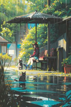 style by snatti, 1girl, rain, solo, sitting, cat, scenery, black hair, outdoors, black cat, skirt, plant, bench, long sleeves<lora:style by snatti-000018:0.8>