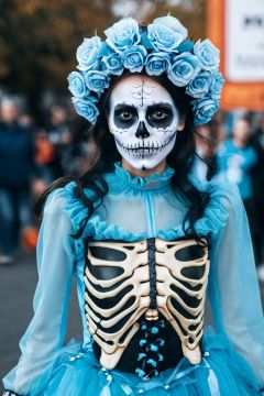 A girl, with a human face and a skeletal body, mixed in the procession of Halloween parade in a blue theme
