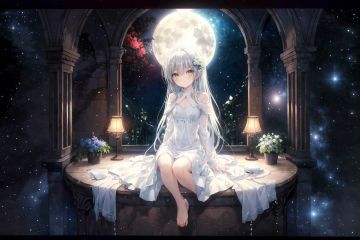 (flat color),colorful,(masterpiece:1,2), best quality, masterpiece, highres, original, extremely detailed wallpaper, (flat color),colorful,(Masterpiece :1,2), best quality, masterpiece, Highres, original, extremely detailed wallpaper, looking at viewer,(mid shot:0.95),(full body:1.25),Dynamic angle,extremely delicate and beautiful,((Balcony)),(nature),(depth of field),amazing,masterpiece,growth,solo,lens flare,she(sitting, admiring the flowers and the moon),loli,little girl,(long sleeves),((arms behind back)),she(long white hair+golden eyes+white simple style transparent dress+hair flower+shiny skin+shiny hair+crystal clear clothes),bare legs,barefoot,Star trail: ((1.3), potted plant, hanging potted the plants, between lamp, potted smallpox, blighting stars, night, elegant, night sky,extremely delicate and beautiful sky,shiny,nebula,star,galaxy,meteor,meteor shower,close-up,petals floating,many flowers,garden,glowworm,daisy, carnation, lavender, lily, chrysanthemum, rose),(looking at viewer)