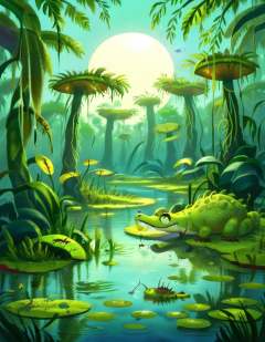 Summer: The swamp is in full swing, with buzzing insects and the occasional glimpse of lurking alligators. The water shimmers under the intense sun, and the swamp exudes a humid, primal energy. Illustrated in a sultry, humid, and exotic art style., sharp focus, particles, detailed, sub surface scattering, (ambient light:1.1) <lora:MODILL_XL_0.27_RC:1>