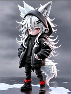 <lora:3Dchaowan-000004:0.8>,guchen,1girl,animal ears,red eyes,long hair,hairclip,black pants,black jacket,black footwear,open clothes,jewelry,standing,necklace,wolf tail,white hair,hood,hands in pockets,snow,hair between eyes,chibi,3D,