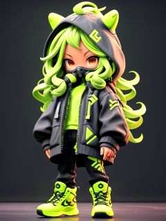 <lora:guchen-3DchaowanV1.0:0.8>,guchen,1girl,hood,jacket,long hair,green hair,mask,black pants,green footwear,long sleeves,standing,dark skin,black jacket,red eyes,curly hair,puffy long sleeves,black background,chibi,3D,