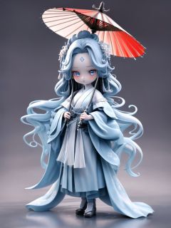 <lora:guchen-3DchaowanV1.0:0.8>,guchen,1girl,umbrella,long hair,hanfu,hair ornament,oil-paper umbrella,blue hair,standing,holding umbrella,chibi,3D,