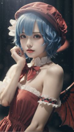 1girl, solo, remilia scarlet, wings, hat, flower, bat wings, red eyes, wrist cuffs, short hair, hat ribbon, upper body, ribbon, slit pupils, looking at viewer, traditional media, blue hair, remilia scarlet