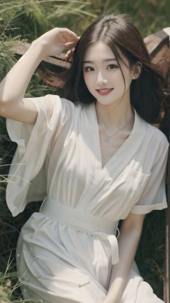 masterpiece, best quality, feena, necklace, white robes, short sleeves, sash, field, sky, looking at viewer, from above, sitting, on ground, smile, upper body, hand to heart