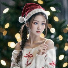 ((Best quality)), ((masterpiece)), 20 year old girl, (red and white striped sweater:1.5), (Christmas hat), Christmas tree, smooth skin, gift box ((side ponytail fried dough twisted braid), ((pale black hair)), bright curious blue eyes, (glitter), edge light, snowflake effect, light particles, contour light, snow, vampire