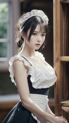 1girl, maid, solo, black hair, blurry, apron, dress, maid headdress, maid apron, looking at viewer, blurry background