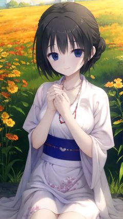 masterpiece, best quality, feena, necklace, white robes, short sleeves, sash, field, sky, looking at viewer, from above, sitting, on ground, smile, upper body, hand to heart