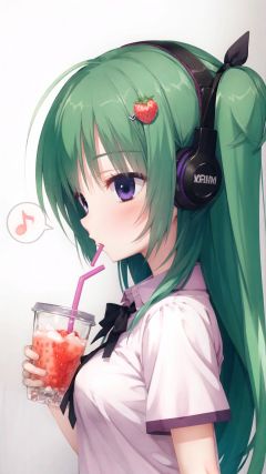 1girl, solo, headphones, looking at viewer, long hair, holding, musical note, hair ornament, pink shirt, drinking straw, shirt, blush, cup, ribbon, holding cup, hair ribbon, short sleeves, from side, two side up, spoken musical note, breasts, looking to the side, bangs, simple background, grey background, white ribbon, disposable cup, speech bubble, strawberry, purple eyes, hairclip, upper body, medium breasts