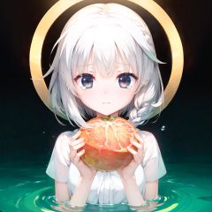 (streaming tears),sad,(grapefruit),(grapefruit),(grapefruit),looking at viewer,both hands on own cheek,White shirt,(white hair, short hair, braid,bangs:1.2),(glowing eyes),ripples,dark water,In water,