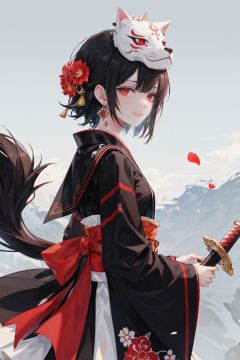 solo, 1girl, kamado tanjirou, male focus, weapon, sword, fox mask, holding, mask, japanese clothes, mask on head, scar on forehead, jewelry, scar, holding sword, earrings, holding weapon, long sleeves, scar on face, katana, looking at viewer, petals, red eyes, from side, haori, wide sleeves, grey background, short hair, brown hair, kimono, simple background<lora:wankeprehdLycoris:0.5>,