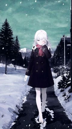 In the snow all over the sky, a girl walking alone in the snow, wearing red thin trench coat, with a white scarf, Bare legs, bare feet, Holding her body tightly,