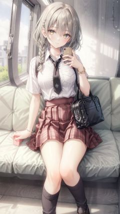 1girl, solo, skirt, long hair, shirt, necktie, sitting, black socks, phone, socks, train interior, bag, cellphone, short sleeves, kneehighs, holding, braid, white shirt, school uniform, collared shirt, holding phone, white hair, twin braids, yellow eyes, pleated skirt, bracelet, jewelry, smartphone, breasts, plaid skirt, closed mouth, school bag, bangs, hair between eyes, grey skirt, plaid, black necktie, thighs, miniskirt, medium breasts, breast pocket, very long hair, pocket