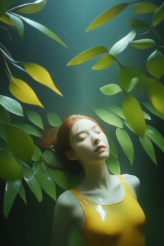 raw photo,yellow spotlight,hyperrealistic,extremely high-resolution details,realism pushed to extreme,fine texture,4k,ultra-detailed,high quality,1girl,from above,parted llips,red hair,closed eyes,partially submerged,underwater,(black sex bodysuit),dynamic pose,(wet surface:0.6),at night,Depth of field,surrounded by leaves,leaves in foreground,jungle,dark theme,frost fog,high contrast,complex background,light and shadow play,, realistic, monkren, Fairy