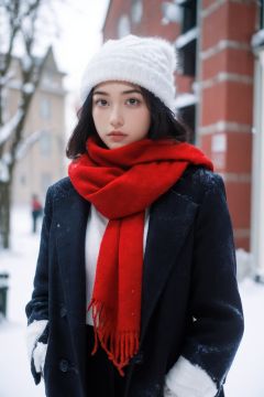 Best Quality,  masterpiece,  Ultra High Resolution,  (photo: 1.4),  outdoors,  snowing,  a girl wearing a plush hat,  red clothes,  red coat,  coat,  winter,  realism,  HD 16K,