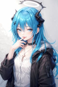 1girl, mostima \(arknights\), solo, horns, halo, long hair, blue hair, fur trim, blue eyes, shirt, cross necklace, white shirt, necklace, jewelry, long sleeves, open clothes, open coat, coat, fur-trimmed coat, upper body, blue tongue, black coat, cross, blue nails, simple background, grey background, bangs, collarbone, nail polish, hand up, gradient background, gradient, black jacket, looking at viewer, tongue, jacket, colored tongue, smile, hood, tongue out, demon horns, finger to mouth