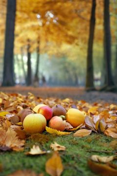 Harvested fruits lie on the forest surface, autumn tranquility, soft light, (autumn theme), beautiful autumn woods, Fuji, bokeh