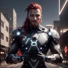 <lora:LEDarrayTech-20:0.8> , ledarraytech , scifi,   geometrical ,   tron, scroll, 1boy,long hair, red hair, glowing eyes, smile ,closed mouth, holding scroll,shaved beard, outdoors,