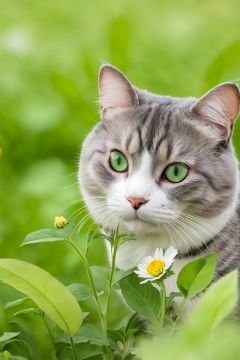 Solo, cat head, caterpillar body, green eyes, full body, flower, outdoor, no people, animals, leaves, grass, plants, animal focus, whiskers
