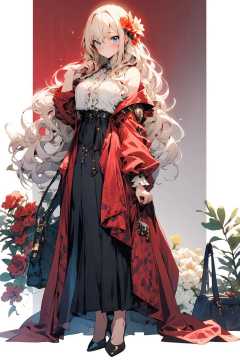 (masterpiece:1.2),best quality,game cg,1girl,solo,long hair,blonde hair,hair ornament,holding bag,bag,high heels,dress,full body,looking at viewer,holding,simple background,blue eyes,standing,hair flower,white background,flower,bangs,black footwear,handbag,red dress,closed mouth,long sleeves,skirt,wavy hair,blush,breasts,very long hair,jewelry,hand up,floral print,frills,<lora:fantasy_20230707233406-000012:1>,