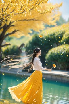 Best quality,8k,1girl, solo, long hair, black hair, orange skirt, skirt, long skirt, white shirt, shirt, outdoors, tree, standing, full body, orange flower, floating hair, wind