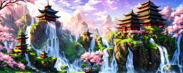 scenery,architecture,east asian architecture,no humans,outdoors,tree,sunlight,day,waterfall,light rays,bridge,cherry blossoms,fantasy,water,pagoda,stairs,building,sunbeam,flower,sky,