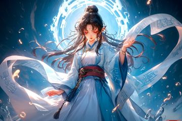 masterpiece,best quality,yiwenrudao\(xiuxian\), Girls, Solo, Long hair, Black hair, dress, Close eyes, Hair accessories, bun, White dress, Long sleeves, Black background, Belt, Dark Background, Chinese dress, Stand, Glow, Wide sleeves, Look down, hand up, Single hair bun, scroll, Shut up, Jewelry, Forehead print, water, Ribbon, Magic, Upper body, Flower, Weibo logo, Light, Blue Background, Watermark, tassel, shawl, floating hair, hagoromo, Blue dress, Brown hair, headband, copyright name, red lips, logo, Facial mark, pointed ears, teeth, makeup, Hanfu,from below,light effects crackling,special effects,cinematic texture,intense contrast,high resolution,HD,8K,<lora:yiwenrudao-1-000006:0.6>,