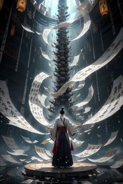 masterpiece,best quality,yiwenrudao\(xiuxian\), scroll, hakama, solo, facing away, japanese clothes, 1boy, scenery, hat, standing, hakama skirt, male focus, black hair, water, wide sleeves, long sleeves, from behind, skirt, black headwear, kimono, outdoors, wide shot, hand up, architecture, arm up, east asian architecture, watercraft, 1other, fantasy, robe, long hair, tate eboshi, holding, black hakama, oversized object, fog, topknot, boat, 1girl, short hair, lantern, tassel, chinese clothes, bridge, nature, artist name, floating, calligraphy brush, smoke, tree, animal, indoors, paintbrush, mountain, white kimono, full body, rock, black footwear, giant, watermark, day, ambiguous gender, signature, waving, outstretched arm, arm at side, light particles, sash, ink, sleeves past wrists, bamboo, glowing, surreal,intense contrast,high resolution,HD,8K,<lora:yiwenrudao-1-000006:0.6>,