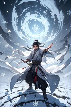 masterpiece,best quality,yiwenrudao\(xiuxian\),1Boy,swordsman,foot on flying sword,overhead view,snow,wind and frost,cold,special effects,sword,<lora:yiwenrudao-1-000006:0.6>,