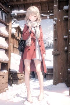 In the snow all over the sky, a girl walking alone in the snow, wearing red thin trench coat, with a white scarf, Bare legs, bare feet, Holding her body tightly,her head bowed, her eyes closed, her mouth pressed together, and she was about to cry, Long white hair blows in the wind, The detailed and beautiful face was depressed,step by step, behind is a series of footprints, the snow is very big, the biting wind blowing her scarf, the distance is unbroken snow mountains, in this evening, helplessforward.